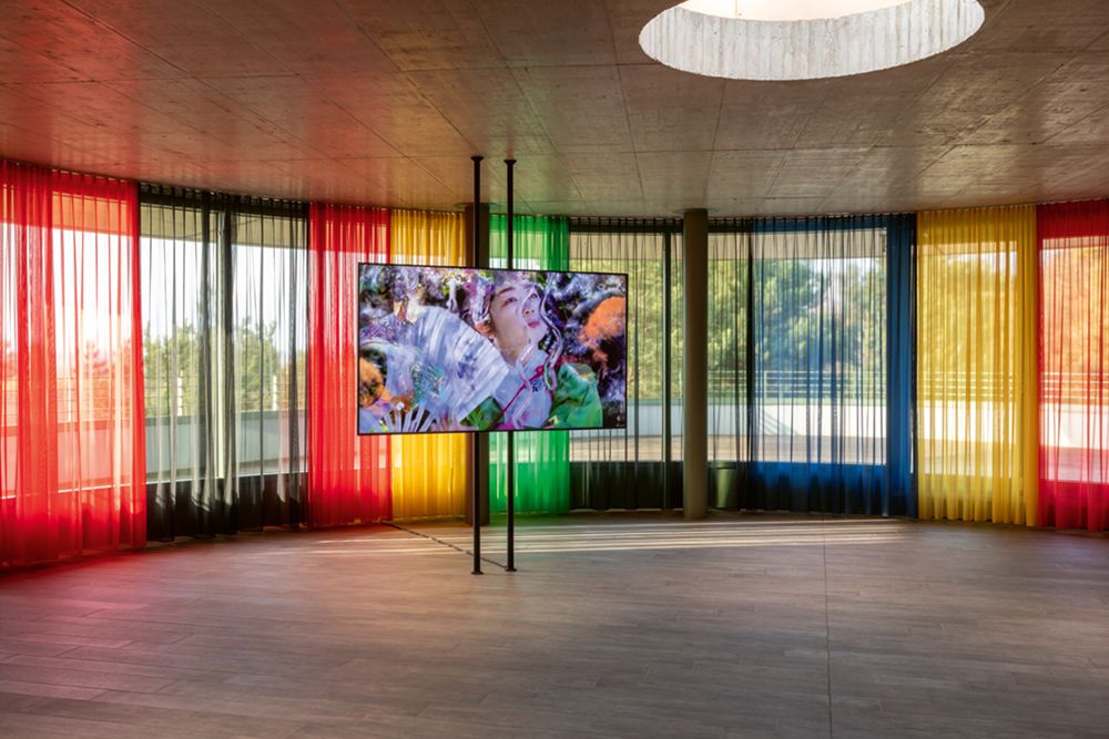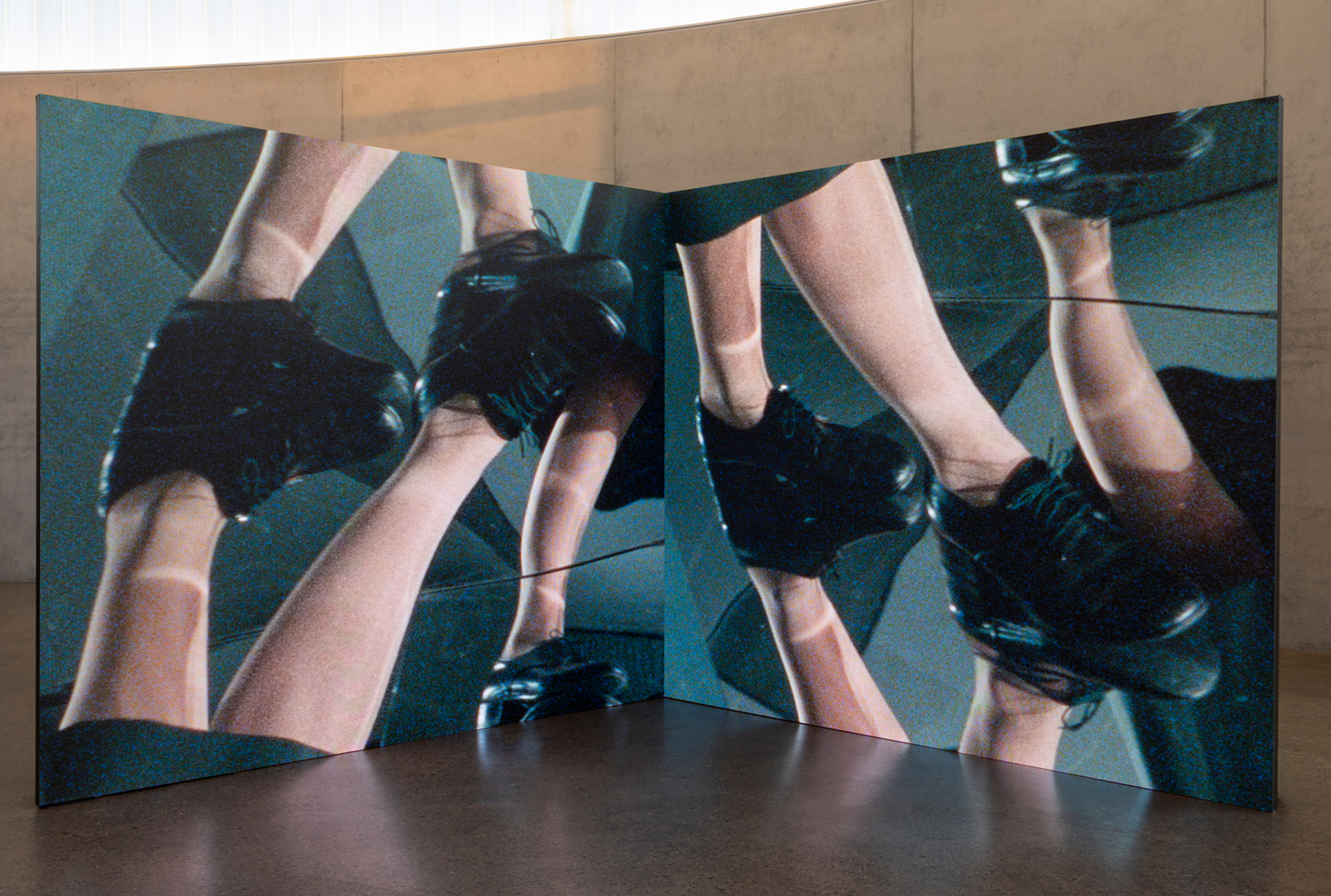 GAMMA (Director’s Cut 16:9), 1999/2023; 4-Kanal-Videoinstallation, Farbe, Stereo-Ton, 6:55 min, Transfer von 16-mm-Film, Variable Dimensionen; Installationsansicht Skulpturenhalle, 2026